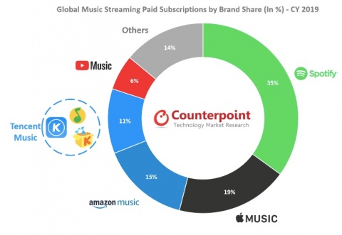 Amazon Music subscriptions reached a 15% share in 2019 compared to 10% in 2018. Tencent (11 percent) and YouTube Music (6 percent) were close behind with the remaining 14 percent split between regional giants like India's Gaana and Russia's Yandex Music.