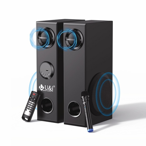 The U&i Mini Twin Tower (UiBS-5166) is a set of Bluetooth bookshelf speakers accompanied by a cordless mic for times when someone has to play the role of an emcee or start a karaoke session. The Mini Twin Tower is a powerful 120-watt system in which each speaker has a 4-inch mid-range driver and an 8-inch side-firing woofer to ensure quality sound output across the aural spectrum. The speakers are accompanied by a cordless microphone for fun karaoke sessions, and include multiple options—such as an FM, AUX-in and USB port—that lets listeners switch to radio, connect an external music player, or even a flash drive loaded with music tracks. The remote control lets one choose from a range of preset sound profiles like Dance, Sport, Sing and Music to enjoy the best output.