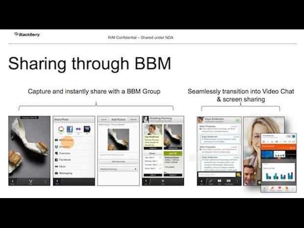 While we await the launch of the BB10 on 30th January, screenshots have been posted on CrackBerry forums, showing a new feature of the BlackBerry Messenger (BBM): Video chat. The screenshots show BBM Video including face-to-face video calls and screen-sharing features. Other discernible features include collaboration, capture, organising content using BlackBerry Remember, and sync. While they are not actual screenshots taken by a user from a device, they seem to be taken from presentation documents shared by RIM under NDA. They do appear authentic.