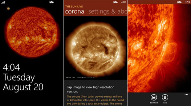 The app brings high resolution images of the chromosphere, photosphere, and corona and it can update your Live Tile and the lock screen background image to keep you updated on the latest activity of the Sun.