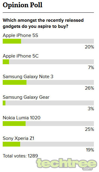 Apple's not-so-innovative wonder, the iPhone 5S and the 5C together managed 27% (which makes it a winner, had it not been for the distribution of votes), hasn’t really made the best use of its fanboy base. However, the final sales figures may (or may not) tell a different story. See the launch analysis here.