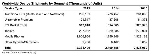 Gartner stats also revealed that PC (desktops + notebooks) sales will continue to fall, with an estimated 276 million units being sold in 2014 when compared to the 296 million units in 2013. However, there's a bright side as 'Ultramobile Premiums' – the not tablets not laptops – continue to post strong growth figures and should provide some relief to the PC industry.